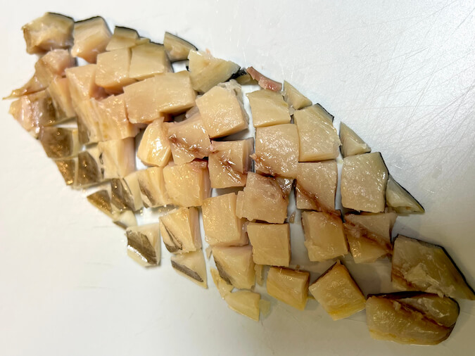 ひものすてーきトロさばを使った、簡単干物活用例その1 カレーの具(写真はクリックで拡大)